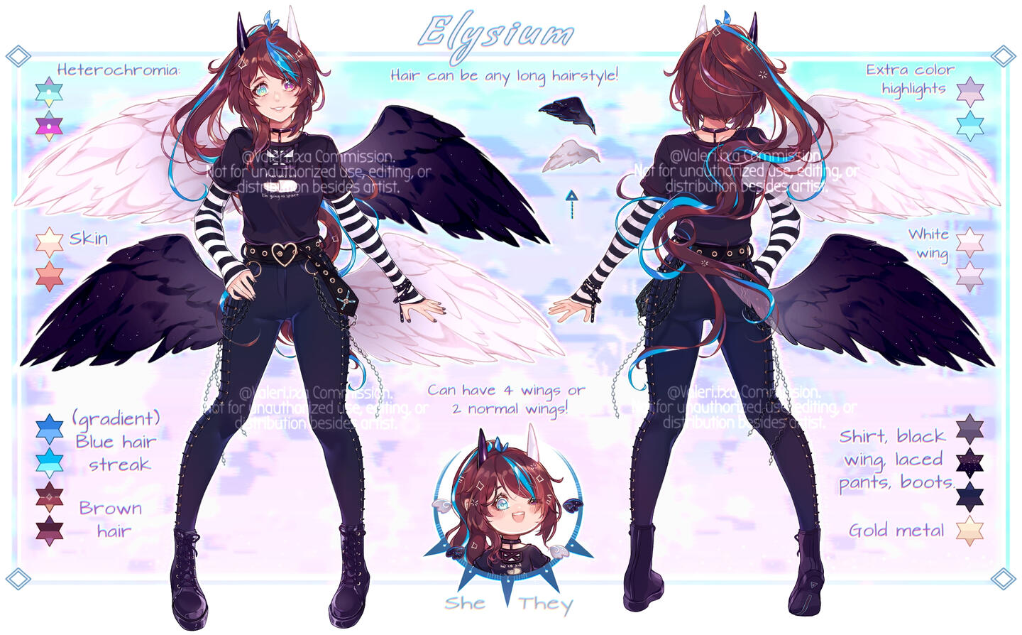 ∙ I give art stage updates: Sketch, clean lines + base colors, coloring update, and final update. More updates can be asked for within reason.∙ Changes during sketch phase is OK within reason! Only minor changes and color corrections are acceptable afterwards.------------------------------3. Character References & Details (what to provide):